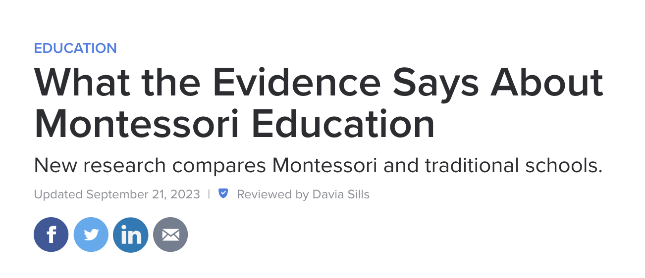 “Montessori students were, on average, a full school year ahead by sixth grade, according to the analysis. The most significant academic gains were in language, math, and general academic ability; there was not a significant benefit in science or social studies.
